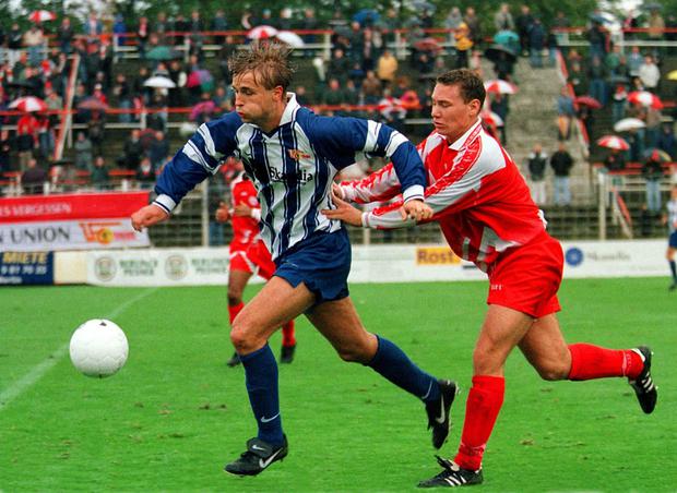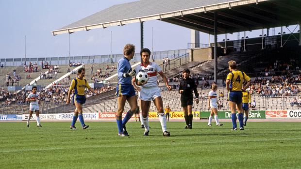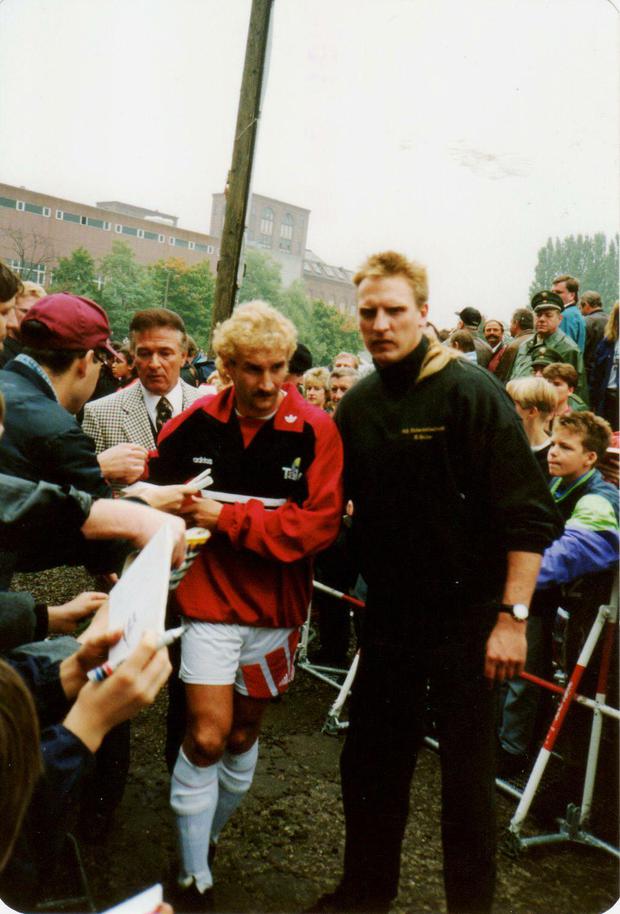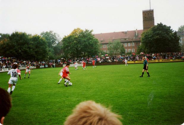 Apropos Haarpracht: Rudi Völler und Bayer Leverkusen kamen 1994 zum 100-Jährigen des Spandauer SV an die Neuendorfer Straße. Und 3300 Zuschauer standen auf den schmalen Tribünen.
