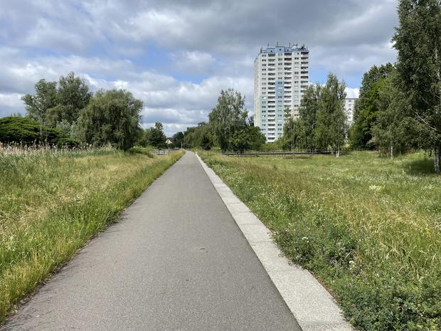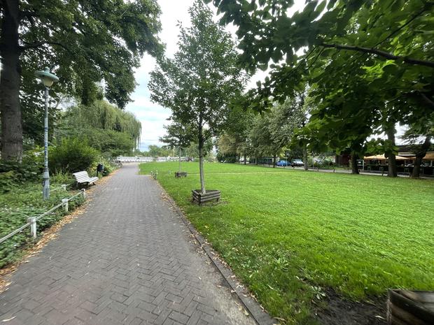 Der Bach ist in der Grünanlage des Ziegelhofs selbst nicht mehr zu sehen: Das Wasser verläuft unter der Grünanlage unterirdisch in Rohren bis zur Havel.
