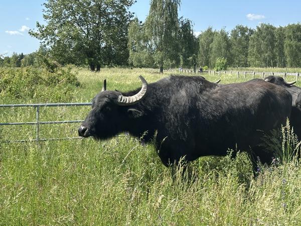 Inzwischen sind Wasserbüffel keine Seltenheit mehr in der Stadt, grasen sie doch auch im Erpetal, im Tegeler Fließ und in Marzahn. Sie gelten als ausgesprochen friedfertig und leben schon seit 6000 Jahren mit Menschen zusammen. Auch mit Wildtieren wie dem Wolf kommen sie gut zurecht, denn der meidet die mächtigen Tiere.