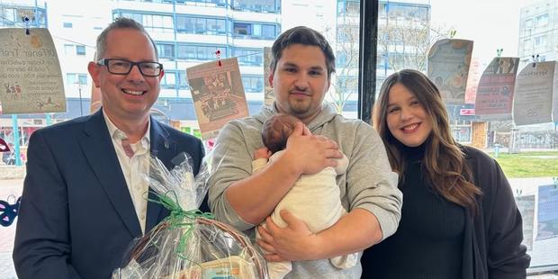 Treptow-Köpenick wächst und wächst. Mit dem kleinen Nilo hat der Bezirk nun offiziell 300.000 Einwohner. Nilo wurde im Februar geboren und wohnt mit seinen Eltern in Altglienicke. Bezirksbürgermeister Oliver Igel (links) beglückwünschte die Eltern, überreichte der jungen Familie einen Präsentkorb und einen Baby-Body mit der Aufschrift „Nr. 300000”.