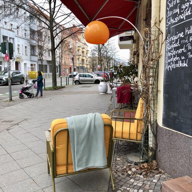 Nehmen Sie Platz, machen Sie es sich gemütlich: Dieses Restaurant auf der Schnellerstraße in Schöneweide lädt Gäste mit Wohnzimmeratmosphäre dazu ein, sich auf ein Getränk niederlassen – auch bei Minustemperaturen, wie bei der Entstehung des Fotos. Wer sich bei dem frühlingshaften Wetter einen Platz sichern möchte, muss vermutlich Glück haben.