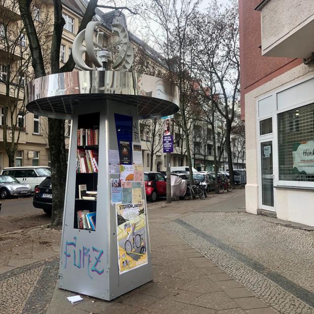 Wie ein Artefakt aus einem Science-Fiction-Film sieht diese Säule aus, die auf der Ecke Plesser Straße und Kiefholzstraße in Alt-Treptow steht. Eingelassen ist ein kleines Regal, in dem Bücher zum Tausch stehen; die Außenseite ist mit Plakaten für Veranstaltungen im Kiez beklebt.