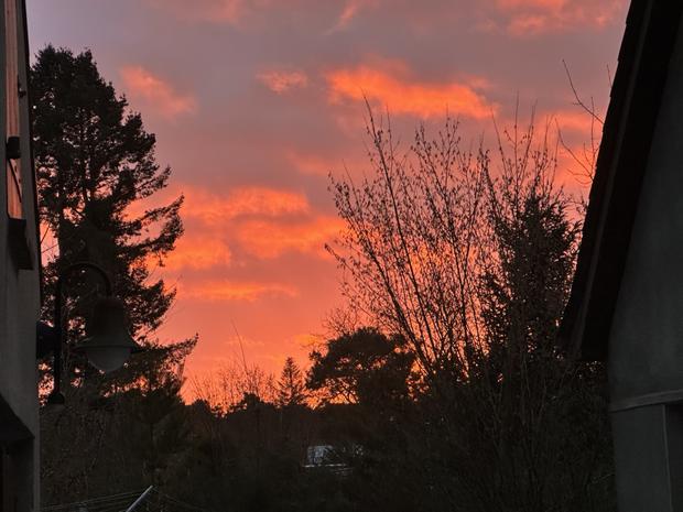 Da lässt sich Klärchen (so wird die Sonne mitunter auch genannt, Anm. d. Red.) so gut wie gar nicht blicken und dann trumpft sie zum Abend hin noch einmal so richtig auf. Hat sie sich nicht wundervoll in Schale geschmissen? Der Himmel scheint in Flammen zu stehen, so kurz bevor es zappenduster wird. Das gibt doch auch Hoffnung.