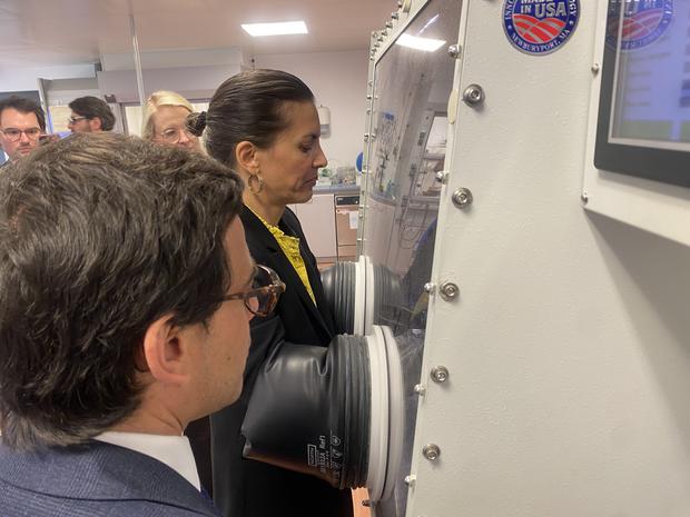 Die Köpenicker Gründerin Sonja Jost zeigt dem EU-Vizepräsidenten Stephane Séjourné und seiner Delegation aus Brüssel im Innovationspark Wuhlheide die neuartige Technik ihres Chemie-Startups Dude Chem. Jost und ihr Team entwickeln Verfahren zur Herstellung pharmazeutischer Wirkstoffe, die weniger Abfall produzieren, auf umweltschädliche Lösungsmittel verzichten und in Europa hergestellt werden können.