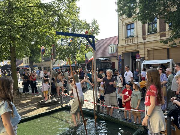 Auch einige Anwohnerhöfe sind an diesem Tag für neugierige Besucher geöffnet. Während hoch oben zwischen den alten Bäumen bunte Kietz-Fische schaukeln, gibt es an allen Ecken Mitmach-Spaß für die Kinder. Beispielsweise Stelzenlauf im Wasser und dabei von einer über dem Kopf baumelnden Möhre abbeißen.