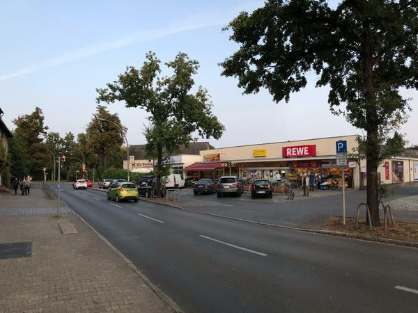 Der Supermarkt im Dorfkern soll auch abgerissen werden. Der ist keine Schönheit, war aber immer da. Hinten gibt es einen riesigen Parkplatz und eine kleine „Bolle“-Museumsvitrine: hier ein Foto. Auch dieser Supermarkt wird – so der Plan – Ende 2021 abgerissen und 2023 wieder öffnen, aber das kann sich auch nach hinten verschieben. Der größere Neubau soll hinten auf dem Parkplatz entstehen, berichtete die Unternehmerfamilie im Herbst im Spandau-Newsletter. Der Parkplatz würde etwas weiter nach vorne rücken.