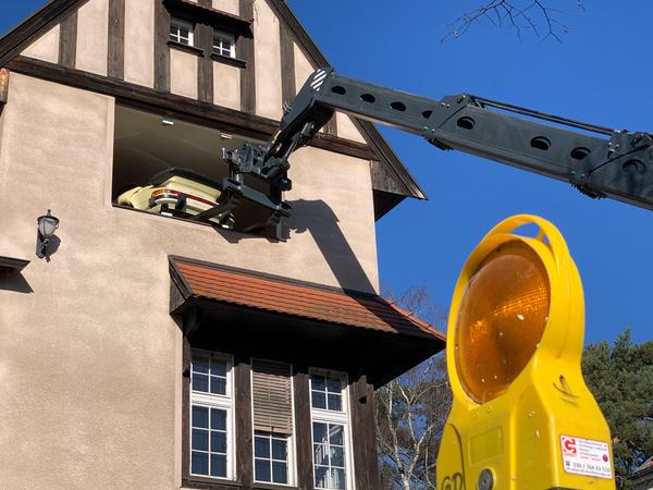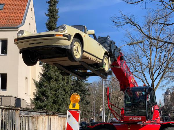Per Kran wurde ein beiges Porsche-Cabrio, Modell Targa, Baujahr 1972, 376 PS, aus dem ehemaligen Kinderzimmer im ersten Stock des denkmalgeschützten Hauses geborgen. Nachdem sich die Vorbereitungen für den Transport auf den Bürgersteig über mehrere Stunden hingezogen hatten, war die Schwebephase nur kurz – der Kranführer brachte die 1.236 Kilo schwere Luxuskarosse in wenigen Minuten sicher auf das Trottoir.