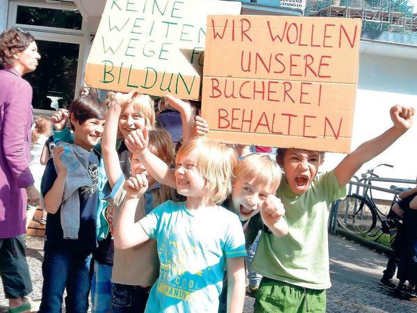 „Wir protestieren – auf allen vieren!“, lautete ein Schlachtruf, der am Montagvormittag in Schöneberg von Kindern skandiert wurde. Auf selbstgemalten Transparenten und Schildern stand „Wir brauchen Bücher!“, „Keine weiten Wege für Bildung!“ oder „Die Bücherei soll bleiben, sonst werden wir verweilen!“.