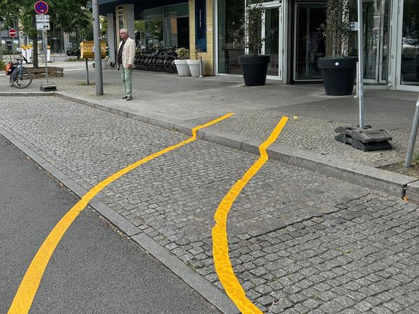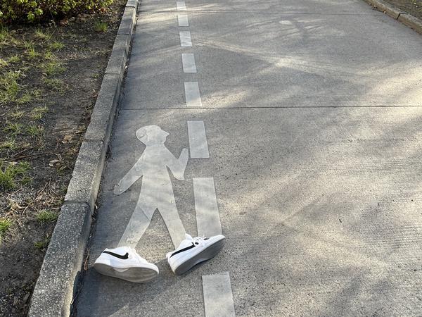 Sind das Siebenmeilenstiefel? Flotte Fahrbahnmarkierungen hat J. Frank auf dem Campus der Virchow-Klinik entdeckt.