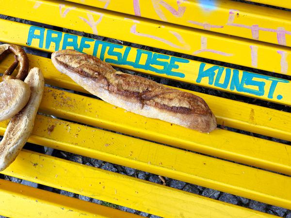 Diese Kunst mag arbeitslos sein, doch brotlos ist sie keineswegs. Erblickt und kunstvoll dokumentiert von Checkpoint-Leserin Ursula Hohmann in Schöneberg.