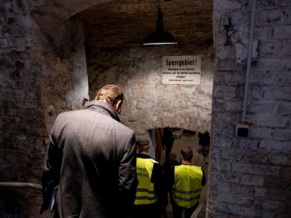 Eine Gruppe von Menschen schiebt sich eine Treppe hinunter, unter ihnen Berlins Bürgermeister Michael Müller (SPD). Es geht herunter in hellhörige Räume, in denen der Klinkerstein an vielen Stellen unter dem Putz zum Vorschein kommt. Die Umgebung wirkt kalt, und auch die Temperatur sinkt. Über einem Türbogen warnt ein Schild: „Sperrgebiet! Unbefugten ist das Betreten verboten.“ Einschüchternde Worte, doch alle Anwesenden sind an diesem Donnerstag befugt.