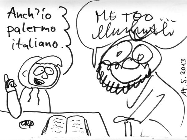 Das Ergebnis, das dank Kritzelbart dem echten Eco bemerkenswert ähnlich sieht, findet sich auf Fromms Internetseite „Hier Comic!“ zusammen mit fast 50 weiteren Comicbegegnungen, Tendenz steigend. Es ist eine bunte Mischung von Prominenten und Freunden des Initiators, Comiczeichnern und zufälligen Begegnungen. Auch Wolfgang Thierse ist dabei. Krakelig, aber dank Brille und zauseliger Frisur unverkennbar. „Schön, dass ich Nachfolger habe!“, sagt der Comic-Thierse da zum Comic-Fromm.
