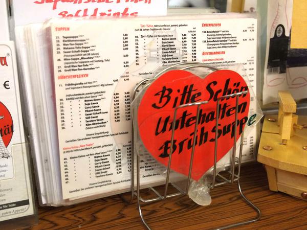 In einem mit Lampions, Kalligrafie-Fahnen und Japangemälden dekorierten Raum können noch einmal zwanzig Menschen auf roten Kunstledersitzen an kleinen Resopaltischen Platz nehmen. Dort wird bedient, die Speisen kosten etwa einen Euro mehr. Stammkunden schlürfen, während sie auf ihre Bestellung warten, eine köstliche Eierstich-Hühnersuppe, die gratis in einem Espressopappbecher über den Tresen gereicht wird.