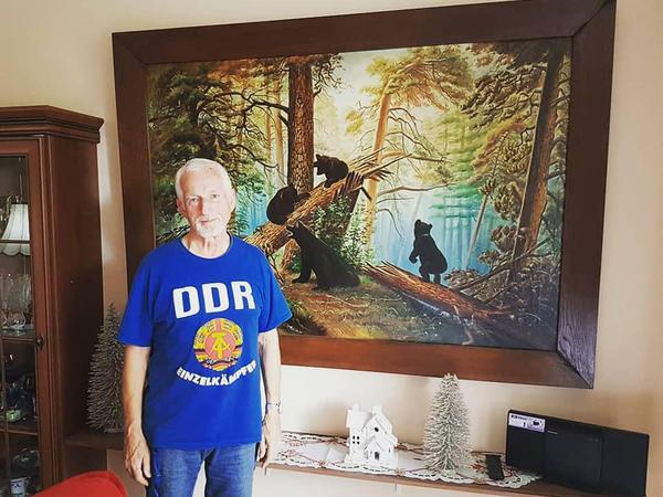 Die Wohnung von Rabe ist picobello bis ins letzte Detail. Die Weihnachtsdekoration steht Mitte September noch – unter dem Gemälde eines sowjetischen Künstlers, das Original hängt in einem Museum in Moskau. Er hat einen festen Tagesplan: Um 5 Uhr steht er auf, um Punkt 8 Uhr nimmt er sich die Grünflächen und Wege rund um den Plattenbau unweit vom Kino International vor. Mit einer Greifzange sammelt er Abfall auf, Kronkorken, Glasscherben, Zigarettenstummel und Taschentücher. Dazu trägt er sein blaues T-Shirt mit der Aufschrift „DDR-Einzelkämpfer“. Er macht das freiwillig und unbezahlt.