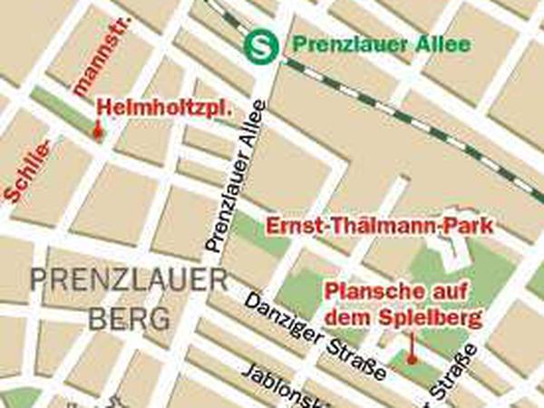 Also wieder rüber über die Danziger Straße und rein in den Park, rauf auf den Hügel zur „Plansche auf dem Spielberg“. Hier habe sie früher auch gesessen, als ihre Kinder klein waren. Mit den anderen Müttern aus dem Riesenbau. Aber es sei nichts Gemeinsames entstanden. Man habe sich beäugt. Wer motzt seine Kinder an, wer cremt sie ordentlich ein? „Milieus erkennen sich“, sagt sie.