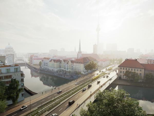 Das fällt schon beim Blick aus der Vogelperspektive auf den Entwurf auf. Sieht die Brücke nicht so ähnlich aus wie das autobahnähnliche Ungetüm, das sich bislang seinen Weg durch Berlins Mitte bahnt? Ja, die neue Brücke wird mehrere Meter schmaler als der bisherige Bau. Und doch bleibt sie mit mindestens 39 Metern riesig. Daran ändert auch die leicht geschwungene Form des Siegerentwurfs wenig.
