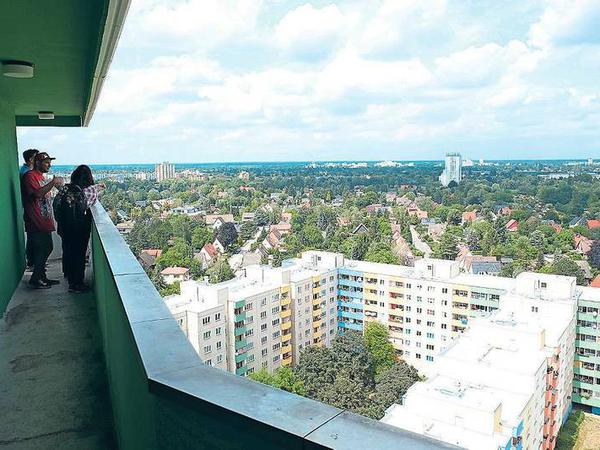 Zwei ungewöhnliche Gefährten stehen in schwindelerregender Höhe auf dem frei zugänglichen Umlauf eines Hochhauses und schauen über die niedrige Balustrade auf ihr Zuhause. Zu sehen ist eines der Armenviertel Berlins: der Staakener Kiez Heerstraße Nord mit seinen Wohntürmen und anderen vielgeschossigen Betonklötzen.