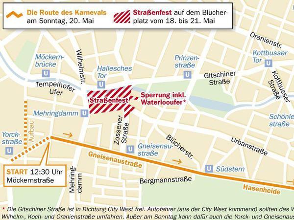 …gibt es schon Sperrungen rund um den Blücherplatz für das Straßenfest zum Karneval der Kulturen; zwischen Mehringdamm und Zossener Straße wird das Waterloo-Ufer gesperrt. Bis Dienstag 6 Uhr. Staus gab es sofort.