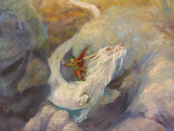 Das große fantastische Gemälde, auf dem sich diese Szene abspielt, zeigt Figuren aus Michael Endes berühmtem Kinder- und Jugendroman „Die unendliche Geschichte“, in dem ein Junge, Bastian Balthasar Bux, in die Welt eines Buches hineingezogen wird. Diese Fantasiewelt wird von einer unheimlichen Macht bedroht und Bastian begibt sich auf eine Reise, um sie zu retten.