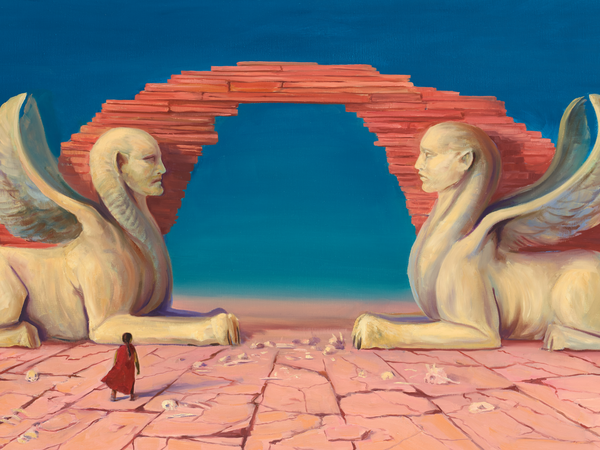 Außerdem ließ Ende sich von einem Ungeheuer-Park in Bomarzo inspirieren, einer Anlage mit grotesken und monsterhaften Steinfiguren. „Dort stehen zum Beispiel zwei Sphinxen, die einander anschauen. Die waren das Vorbild für das Große Rätseltor und auch für meine Darstellung hier“, sagt Meschenmoser und zeigt auf das große Gemälde mit den mythologischen Figuren.