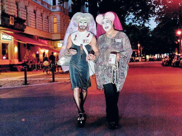 Küsschen rechts, Küsschen links. Man kennt sich in der Schöneberger Szenekneipe. Die beiden auffällig geschminkten Gäste sind aber nicht zum Biertrinken oder Flirten hier. „Schwester Latea“ und „Schwester Sunshine“ nähern sich zwei Kerlen am Tisch. Der eine gestreckte Arm mit den beringten Fingern bietet einen Infoflyer an, der andere eine Kondompackung. „Für die schnelle Nummer“, steht da drauf. Die Männer am Tisch winken ab. Sie wollen ungeschützten Sex. Die Schwestern ziehen weiter zum nächsten Tisch, hier wird das Gratisgeschenk mit einem Grienen angenommen. Das freut die Ehrenamtlichen im Dienste der Aids-Prävention. „Wir wollen ja nicht in den Darkroom gehen und uns mahnend neben die Männer stellen“, sagt Schwester Latea, „aber wir appellieren an die Eigenverantwortung.“