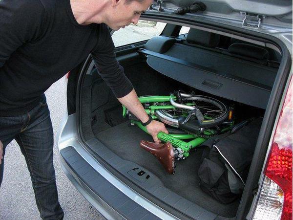 Zusammengefaltet passt das Rad in jeden Kofferraum. Auch wenn diese Behauptung trotz der auf Wunsch lieferbaren profillosen Kojak-Reifen etwas übertrieben erscheint: Das Brompton glänzt mit seiner unglaublich kurzen Faltzeit und seinem geringen Faltmaß. Zusammengefaltet (57 x 58 x 27 cm) passt es in den Kofferraum nahezu jedes Pkw und kann problemlos wie ein Gepäckstück auch in Bussen und Bahnen mitgenommen werden - ganz ohne Zusatzticket. Flugreisende verstauen es entweder in einem Karton oder greifen zur eigens von Voss Spezialrad entwickelten Transportbox. Ihr Vorteil: Sie lässt sich, wenn sie nicht gebraucht wird, ebenfalls platzsparend zusammenfalten.
