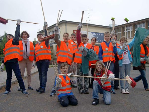 „Ih, die sehen ja aus wie Grillzangen“, ruft die 13-jährige Antonia erstaunt und blickt auf die Holzzange zum Müllaufsammeln in ihren Händen. „Dann machen wir jetzt eben ein Müllsteak“, kichert ihr Mitschüler Pascal. Die Klasse 6a/b der Biesalski-Förderschule in Zehlendorf räumt ihren Kiez auf: den Hüttenweg, die Taylorstraße und die Flanaganstraße. Alle 11 Schülerinnen und Schüler der Klasse nehmen einen Besen und eine Müllzange in die Hand. Es dauert nicht lange, bis sie den ersten Müll auf den Straßen um ihre Schule gefunden haben. „Guckt mal, eine alte Stoffmütze“, ruft Antonia und hält das Fundstück in die Höhe, um es anschließend in einem blauen Müllsack verschwinden zu lassen. Die meisten Schülerinnen und Schüler der Klasse 6a/b wohnen zwar nicht selbst in Zehlendorf, sondern in anderen Bezirken, aber es ist ihnen trotzdem wichtig, dass die Straßen um ihre Schule sauber sind. „Das ist eine coole Aktion. Wir haben kein Mathe und machen dafür Berlin sauber“, freut sich Antonia. Um den Schulhof hat sich am vorigen Tag schon die Klasse 5a/b der Schule gekümmert. Der 11-jährige Farid erzählt: „Wir haben total viel Müll gefunden, der nicht von uns war. Den hat einfach jemand über den Zaun geschmissen.“ Er schüttelt empört den Kopf. Jetzt wo er selbst sauber gemacht hat, nimmt er sich vor, in Zukunft keinen eigenen Müll mehr rumliegen zu lassen.