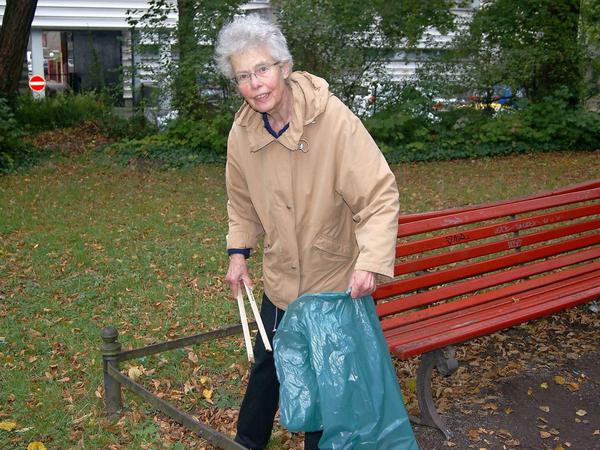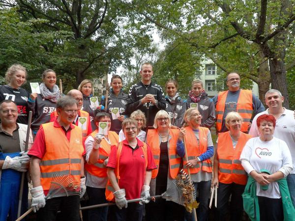 Karola Kronheim ist seit 45 Jahren ehrenamtlich bei der Arbeiterwohlfahrt, mittlerweile als Kreisvorsitzende Südwest. Am Samstag dirigiert sie eine 20-köpfige Putzkolonne durch den Park am Carmerplatz. „Eine muss sagen, wo vorne ist“, beschreibt die 70-Jährige ihre Rolle. Kronheim packt selbst mit an, sammelt Plastikmüll und Kippen auf und fischt sogar einen ausrangierten Sonnenschirm aus dem Gebüsch. Hilfe kommt von der Frauen-Handballmannschaft des BFC Preussen. Man kennt sich gut, man hilft sich gern. „Wir wollen Flagge zeigen im Kiez“, sagt Trainer Sven Plötz, bevor er sich wieder dem Herbstlaub widmet.