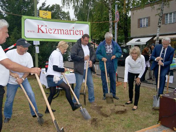 Sogar der Bürgermeister ist gekommen. Lächelnd hält Norbert Kopp (CDU), Bezirksbürgermeister von Steglitz-Zehlendorf, einen Strauß roter Rosen in der Hand. Im nächsten Monat sollen die Rosen bereits zu seinen Füßen blühen, denn Norbert Kopp steht auf der Mittelinsel vor dem Bahnhof Lichterfelde Ost, auf der am Freitag anlässlich des Saubere-Sache-Aktionstages der erste Spatenstich für eine Neugestaltung und -bepflanzung der Insel erfolgt ist. Die Bürgerinitiative „Kiezmarien“, die sich seit 2009 um die Aufrechterhaltung und Verbesserung der Lebensqualität im Kiez um den Marienplatz kümmert, will die Mittelinsel mit bodendeckenden Rosen bepflanzen. Dafür hat die Senatsverwaltung für Stadtentwicklung und Umwelt 3000 Euro aus dem Fonds für die Förderung des freiwilligen Engagements in Nachbarschaften bereitgestellt. Norbert Kopp führte am Freitag zusammen mit Mitgliedern der Bürgerinitiative den symbolischen ersten Spatenstich für das Beet durch. „Ich freue mich über das Engagement der Bürger“, betonte er. Auch Sigfried Tulke, Vorstandsvorsitzende der Initiative, freut sich über die gute Kooperation mit dem Bezirk. „Durch das Beet wird der Bahnhofsvorplatz aufgewertet“, sagt er. Am Samstag wird sich nicht nur über das neue Beet gefreut, sondern auch der Kiez rund um den Marienplatz sauber gemacht. Helfende Hände sind auch heute willkommen.