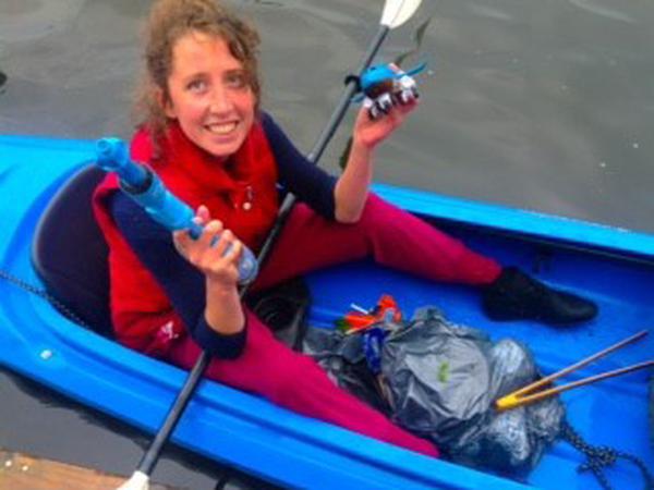 Und ganz schön nass. Nicht weit davon zieht die Au-pair-Französin Suzanne am Rummelsburger See bei einer Clean up-Regatta im Kajak jede Menge Plastiktüten und Styropor aus dem Wasser.