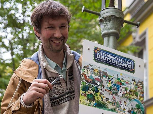 „Die schönste Straße Deutschlands 2013“ steht auf dem Blech an der Laterne, darunter eine bunte Zeichnung von Janosch, gemeint ist die Emdener Straße in Moabit. Nochmal: Die Emdener Straße in Moabit ist jetzt ganz offiziell Deutschlands schönste Straße. Das macht schon stutzig, auch die drei Knaben, die sich während der Zeremonie ins Foto drängeln. „Was, Alter, unsere Emdener? Hä? Neee, Alter.“
