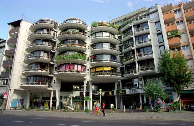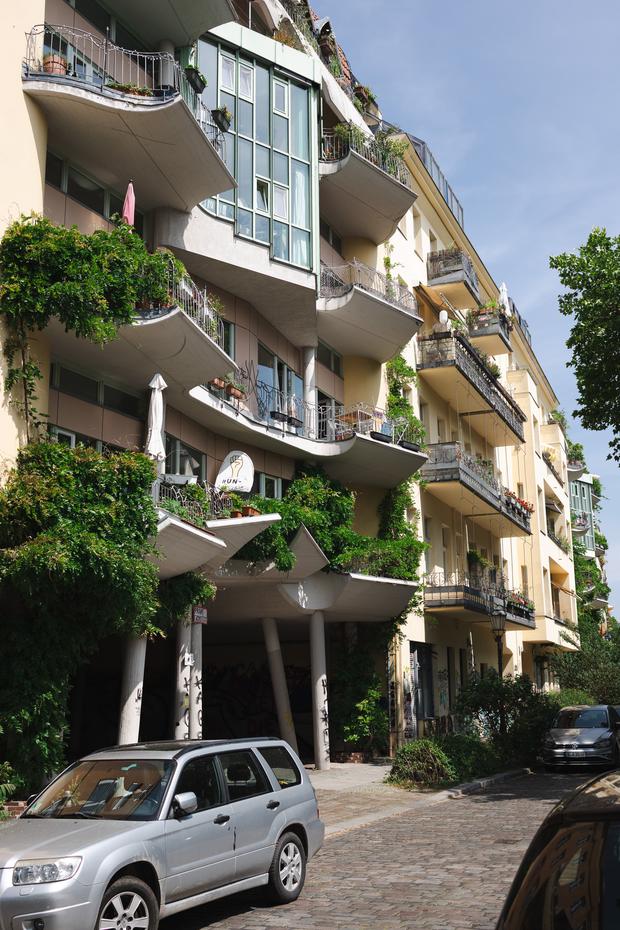 Auch ein Wohnhaus in der Dessauer Straße in Kreuzberg fällt mit verwunschenen Erkerfenstern, filigranen Balkonen und die Durchmischung von Funktionalität und Ästhetik auf.