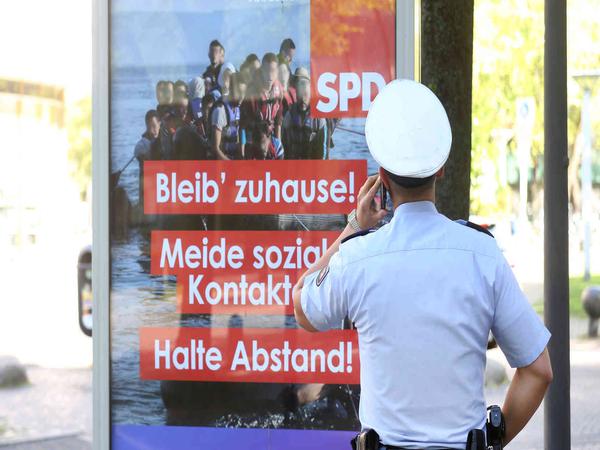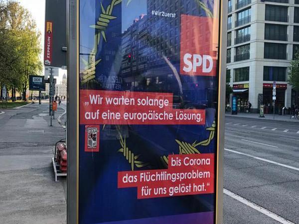 Die gefälschten SPD-Plakate hingen in sogenannten City Light Poster-Vitrinen. Unbekannte hatten die Kästen geöffnet und sie dort hineingehängt. Fünf Motive wurden bekannt. Ein Plakat zeigte das Foto eines Bootes voller Flüchtlinge. Daneben stand: „Bleib' zuhause! Meide soziale Kontakte! Halte Abstand!“ Darunter auf den Farben einer Deutschlandflagge die Forderung: „Wir zuerst“. Ermittelt wird wegen des Verdachts der Volksverhetzung.