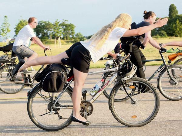 Doch es gibt nicht nur Yoga für das Rad, sondern auch mit dem Rad. Das bietet Yogalehrerin Nica Nadezda Agapova an. Sie hat spezielle Übungen wie den „Radler-Gruß“ oder den „Speichen-Spanner“. Bei Letzterem sollen Radfahrer nebenbei abwechselnd Arme und Beine anspannen – jeweils für zehn bis 30 Sekunden.