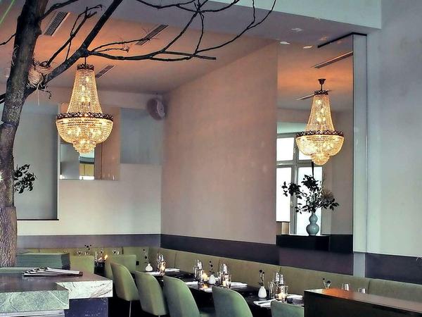 Das Ambiente in der Gärtnerei ist ausgesprochen angenehm. Große Blumenarrangements und die kunstvoll zurecht gestutzte Krone eines kahlen Baumes setzen ästhetisch ansprechende Akzente über langen, zart graugrünen Sofas und lackierten Holztischen mit dicken weißen Kerzen drauf. Ein Kristallleuchter im hinteren Teil verleiht dem Raum eine dezent festliche Note. Zum rosa Crémant (7 Euro) gibt es köstliches Sauerteigbrot mit hausgemachter Leberwurst und grüner Tannennadelbutter. Ein Schälchen mit grob gekörntem Salz steht auch bereit, vermutlich aus dekorativen Gründen. Zwei Leute bespielen den dreigliedrigen Raum, der leider nicht so gut gefüllt war, wie er es vermutlich verdienen würde.