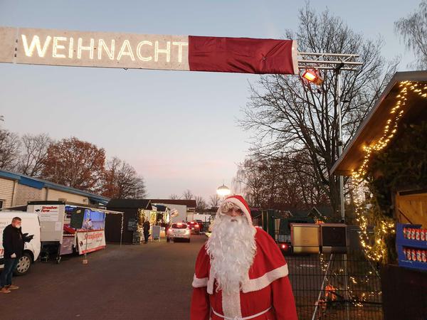 Der Nicht-Markt ist in zwei Autospuren geteilt, die Buden sind jeweils auf der äußeren Seite aufgestellt. „Links ist süß, rechts herzhaft“, erklärt der Weihnachtsmann anrollenden Besuchern am Tor. Für Kinder gibt es zur Einstimmung einen kostenlosen Schokoweihnachtsmann.