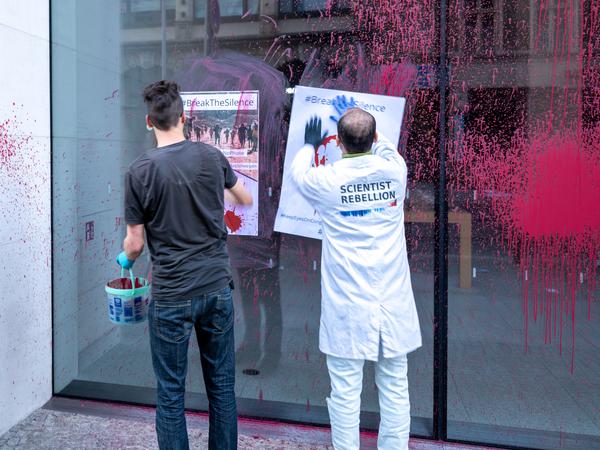 Um gegen Ausbeutung von Arbeitern im Kongo zu demonstrieren, haben Aktivisten von Fridays for Future einen Apple Store mit roter Farbe beschmiert. Am Nachmittag soll es eine Kundgebung geben.