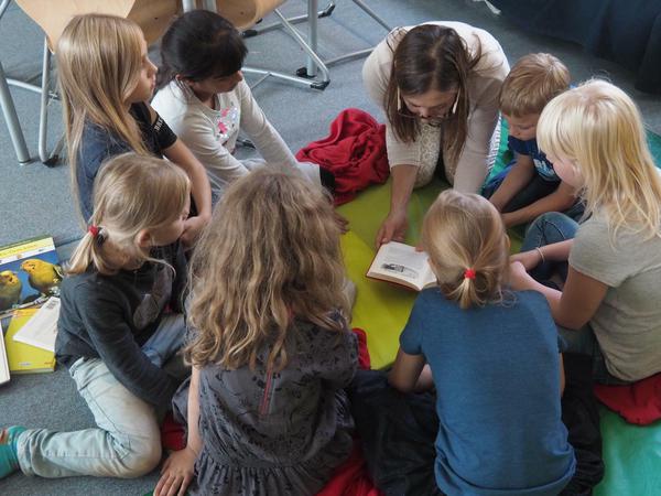 Bianca Böttcher ist als ehrenamtliche Vorleserin da. Etwa 15 Kinder sitzen gebannt um sie herum und lauschen. Böttcher, die eigentlich in der Verwaltung tätig ist, wurde für den heutigen Tag freigestellt, um sich engagieren zu können.