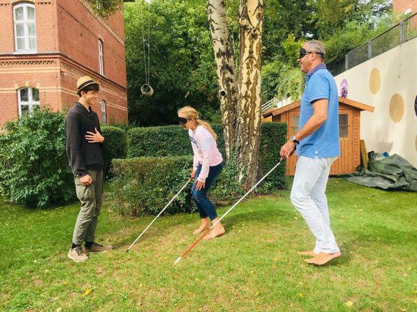 „Das ist vielleicht Erde“, verkündet Hannah etwas unsicher. Ihr Vater schüttelt den Kopf: „Ich vermute Steine mit Rillen.“ Tatsächlich können Vater und Tochter die Leitlinien für Blinde nicht erkennen, da ihre Augen verbunden sind. Auf dem Integrativen Kiez-Bazar am Sonntag an der Rothenburgstraße erlebt die Familie, wie schwierig es für Ungeübte ist, nur auf Gehör und Tastsinn angewiesen zu sein.