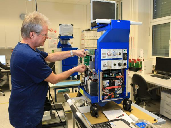 Stolze 90 Kilo bringt „IKUS“ auf die Waage - und damit deutlich mehr als seine kleinen Patienten. Er sieht aus wie der Servierwagen einer Stewardess, aber transportiert keine Snacks und Getränke. „IKUS“ ist der Antrieb des Kunstherzens und rettet Leben.