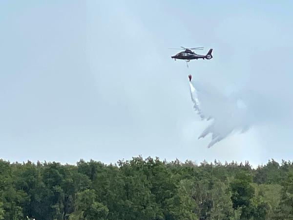 Behindert werden die Arbeiten dadurch, dass das Gebiet munitionsbelastet ist. Zwei Hubschrauber der Bundespolizei unterstützen die Einsatzkräfte aus der Luft beim Löschen. Dass dort Munition explodieren kann, sei nicht ausgeschlossen, die Sicherheit der Feuerwehrleute gehe vor, hieß es.