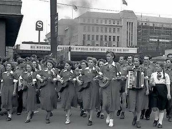 Nicht ganz so exotisch wirken die Polizeiübungen mit Gewehr vor dem roten Rathaus, denn auch die Alliierten haben bis in die achtziger Jahre solche Übungen im Westteil abgehalten. Aber der Krieg hallte überall nach, selbst in der Art, wie die Waldbühne 1951 zu ihrem Freilichtkino-Programm einlud: „Willkommen zum friedlichen Wettstreit der Filmnationen!“