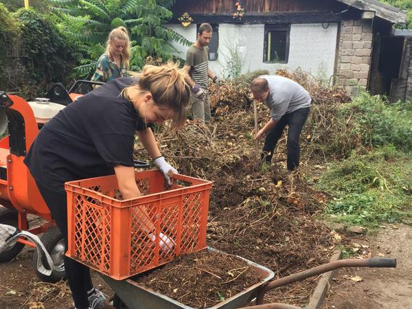 Zusammen mit Nachbarn der Gartenkolonie wird die Fläche aufbereitet und eine Grundbasis geschaffen. Eine extra gemietete Häckselmaschine läuft, ein Kompost wird angelegt und zwei große Container werden gefüllt mit Müll, der auf dem Grundstück lag. Auch Kitas sollen in Zukunft eingeladen werden.