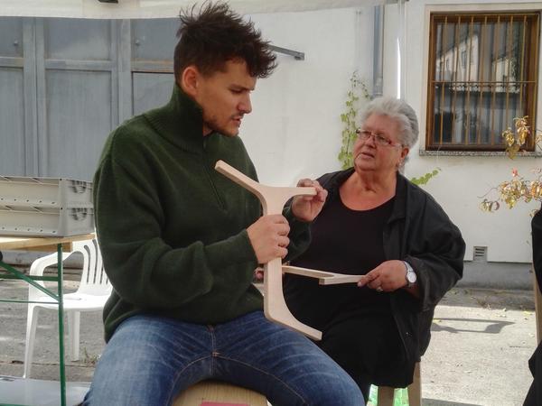Johannes Dumpe fräßt Stuhlteile aus einer dicken Holzplatte. Dabei sehen im gut 10 Nachbarn zu, die sich um einen Kaffeetisch versammelt haben. Die Stühle werden eines Tages einmal in dem neuen Stadtteilzentrum stehen, was der Bezirk Friedrichshain-Kreuzberg in der Friedensstraße plant. Momentan ist hier nur ein leerer Hinterhof in dem regelmäßig Veranstaltungen der Volkssolidarität stattfinden. Die Gruppe hat hier heute bereits Unkraut gerupft und Obst und Gemüse geerntet. Nach einiger Zeit kommt auch der Sozialstadtrat und stellvertretende Bezirksbürgermeister Knut Mildner-Spindler in den Hof. Er probiert vorsichtig einen der Stühle aus und ist sofort begeistert: “Eine tolle Idee, einen Teil der Einrichtung gleich hier mit den Leuten zu machen“, findet er. Leonard Scharfenberg