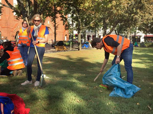Mit Greifern werden Zigarettenstummel entsorgt, Flaschen werden eingesammelt und anderer Müll wird zusammengekehrt. Nach und nach wird die Grünfläche von dem Müll befreit und erste Eltern mit Kindern breiten ihre Decken für ein Picknick aus.