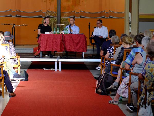 Die angenehme Kühle der Krankenhauskirche im Wuhlgarten in Berlin-Marzahn bot für zwei Stunden Zuflucht von der aufgeheizten Stadt, die zwei grundverschieden politisch eingestellte Männer auf der Bühne dafür nutzen, sich trotz aller inhaltlicher Differenzen ungewöhnlich harmonisch anzunähern.