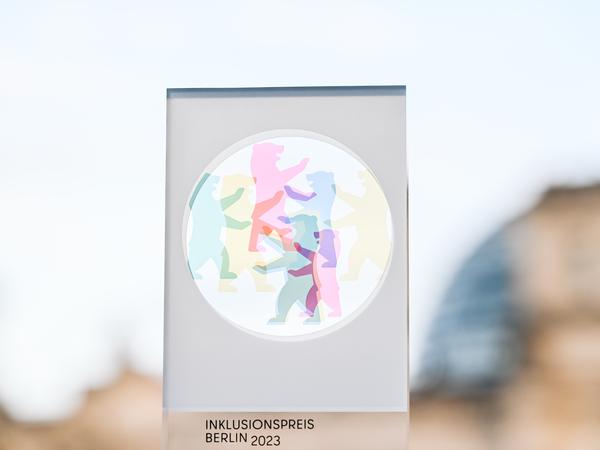 Bevor man durch die denkmalgeschützte Holztür geht, bleibt der Blick an einer Fotowand hängen. Alle 40 Künstler im Alter von 18 bis 63 sind hier mit Schwarz-Weiß-Foto ausgestellt. Nummer 41 ist die Hafenkatze, die ab und zu vorbeikommt. Im Büro von Gesine Koher steht ein Anschauungsobjekt des Preises, 28 Zentimeter hoch, 15 Zentimeter breit, viereinhalb Zentimeter tief, es besteht aus mehreren Schichten Acrylglas. Im Zentrum befinden sich Bärenfiguren in Rot, Blau, Gelb und Grün. Auf dem Sockel steht: „Inklusionspreis Berlin 2023, Inklusive Beschäftigung“.