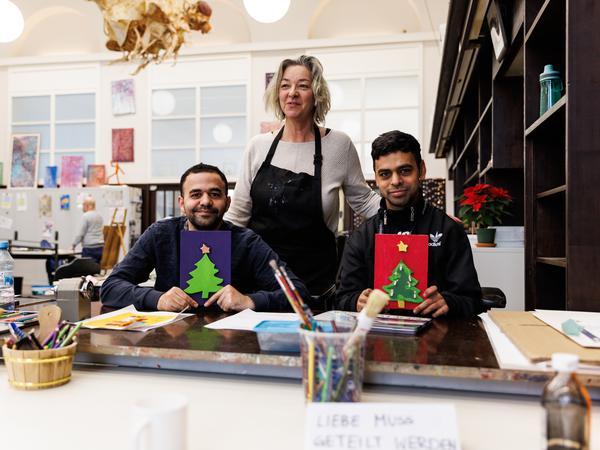 Die Holztür stammt noch aus der Zeit, als das Gebäude am Westhafen die Wirtschaft für Matrosen und Kapitäne war. Heute trennt sie den kleinen Vorraum vom großen Atelier, in dem 40 Menschen mit komplexer Beeinträchtigung Kunstwerke erschaffen. 2019 war der Umbau fertig, die Künstler konnten einziehen. Heute zeichnen rund 25 Mitarbeiter konzentriert an Bildern. „Einige wurden von der Krankheitswelle gepackt, andere haben Urlaub“, erklärt Gesine Koher, die Imperfekt leitet. Die Kunstwerkstatt gehört zu den Berliner Werkstätten für Menschen mit Behinderung (BWB), die berlinweit zwölf Standorte unterhalten. Mehr als 1.600 Menschen mit Beeinträchtigungen können hier ihr Recht auf Bildung, Förderung und Arbeit wahrnehmen.
