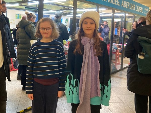 Um den notgedrungenen Unterricht in U-Bahnhöfen der Ukraine zu illustrieren, sitzt während des Pressetrubels eine Schulgruppe der Jenaplanschule Neukölln im Klassenzimmer mitten im U-Bahnhof. Zwei von den etwa neunjährigen Schülern, Else und Luka, erklären gegenüber dem Tagesspiegel, was sie über die Aktion denken.