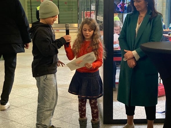 Zwei Schülersprecher der Jenaplanschule Neukölln tragen zusammen vor, was ihre Schülergruppe den ukrainischen Kindern wünscht. Darunter immer wieder Wünsche für Frieden, Hoffnung, Gleichberechtigung, genug Essen und Trinken, aber auch ein schönes Weihnachten.